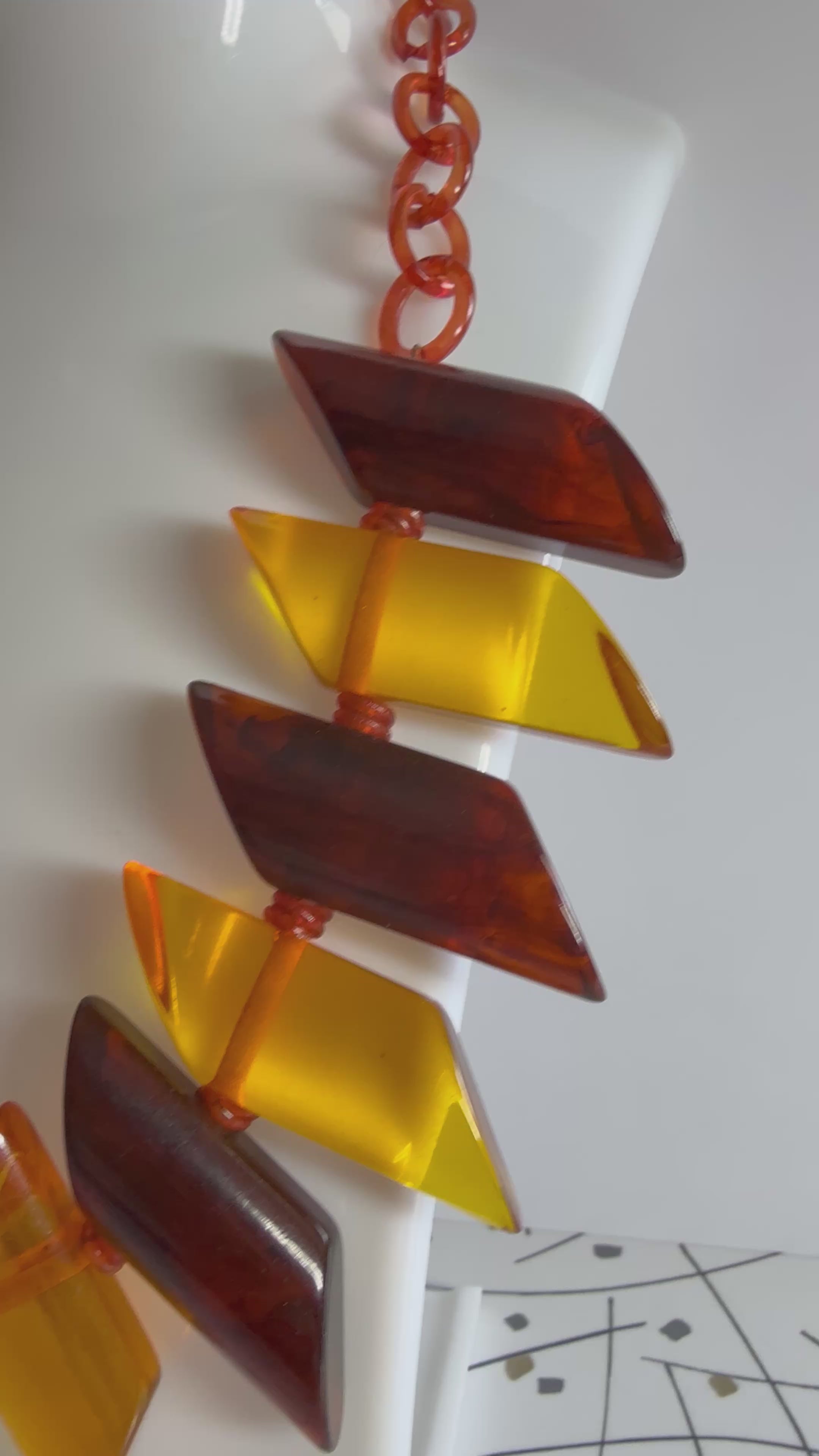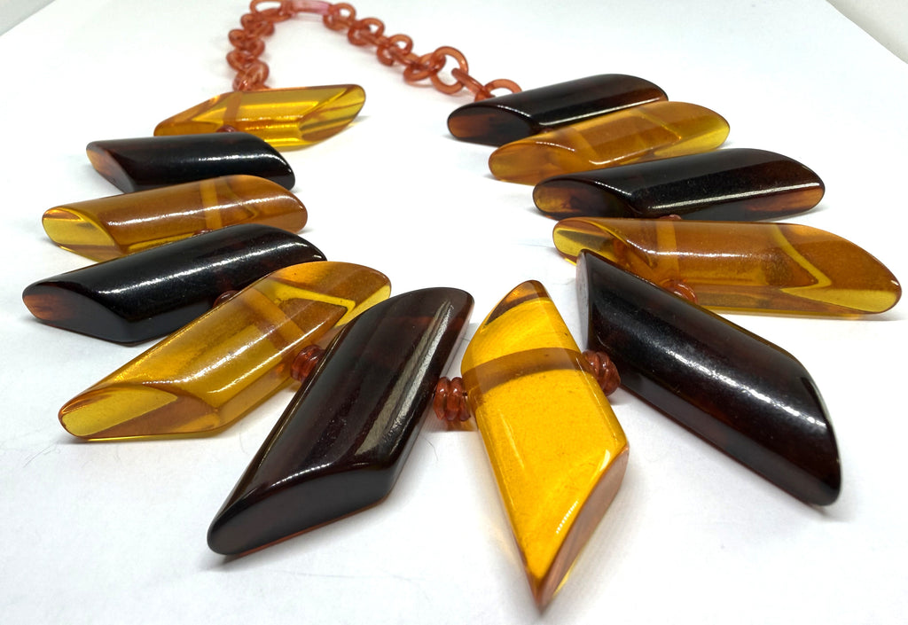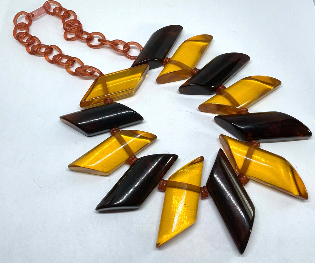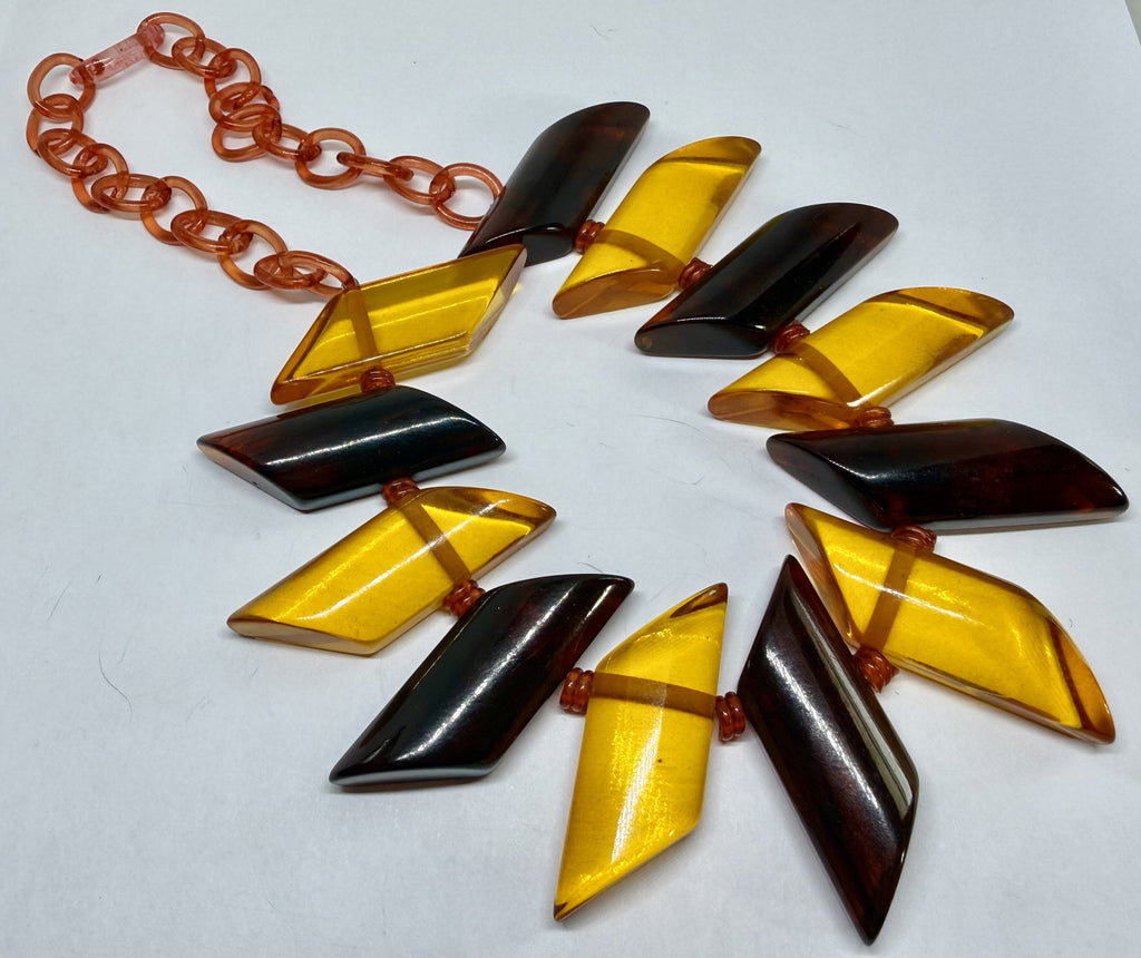 This is a rare, 1930 bakelite necklace with apple juice bakelite and celluloid. It has been tested with simichrome. It's in great condition but the clasp, although original is easy to separate so an additional metal clasp will be included for extra wearing safety.