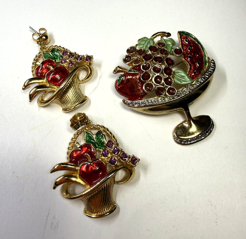 1.5 inches dangles and 1.5 inch in depthBrooch is over 2.25 inches in length - unsigned but a perfect marriage of jewelry