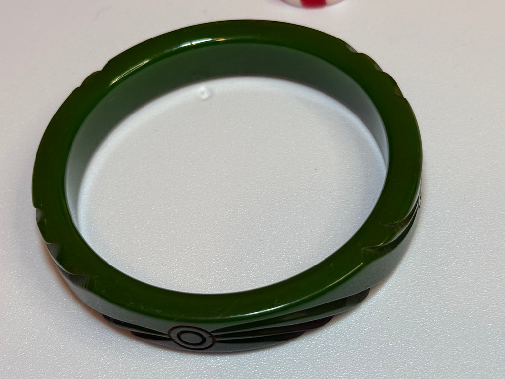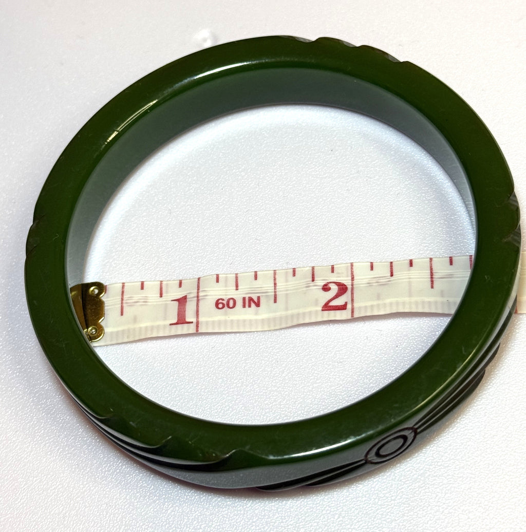 Own a piece of 1940s design history with this exquisite carved bakelite bangle. The rich green hue and intricate hand-carved details showcase the superior craftsmanship that defined mid-century jewelry—a quality rarely found in today's mass-produced accessories.