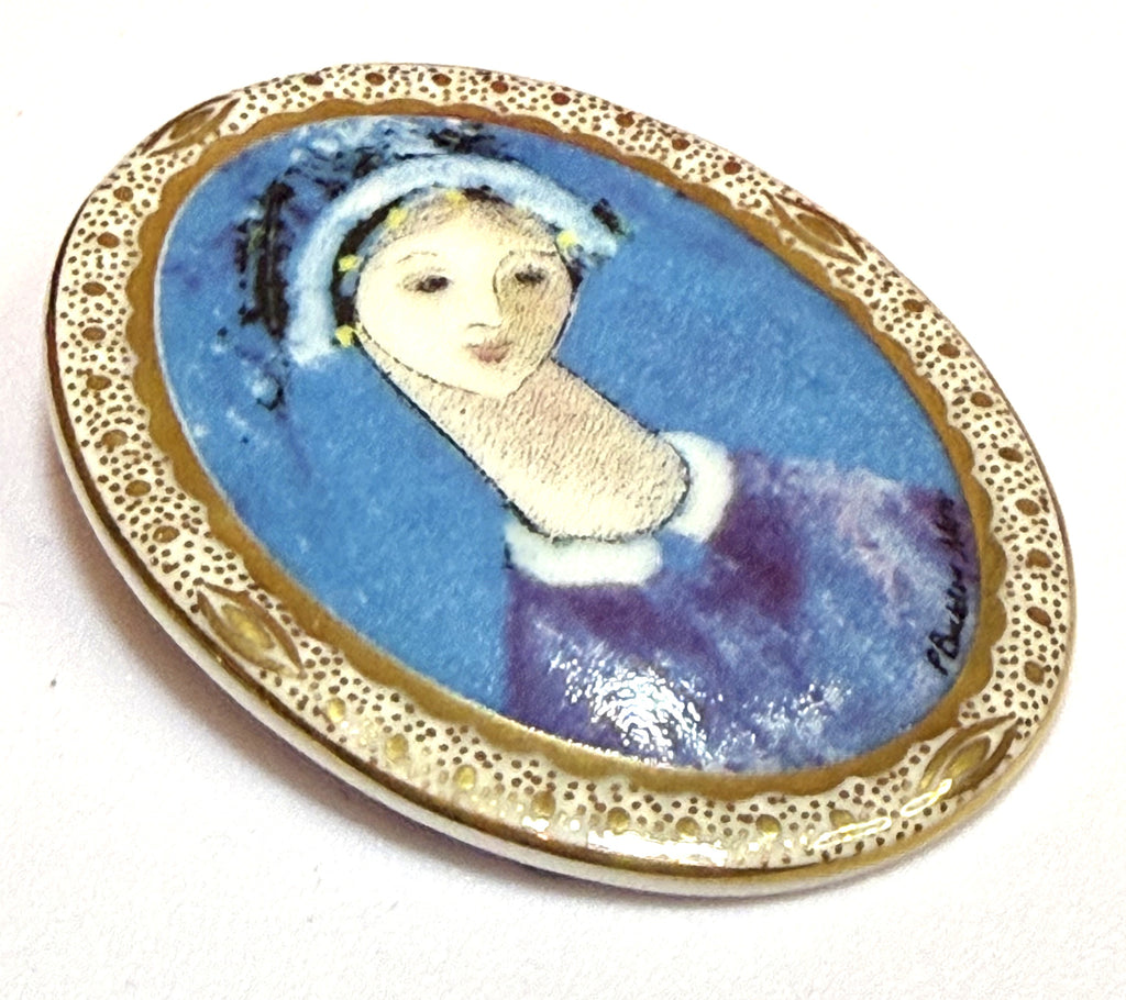 Handcrafted by the P Buckley Moss Society in 1997, this charming limited-edition ceramic brooch (items numbered:. 26967) features an original hand-drawn portrait with a striking 24K gold-painted border. Versatile and collectible, it clips on as a brooch or hangs as a pendant—perfect for vintage lovers who appreciate artisan craftsmanship and a touch of nostalgic whimsy.