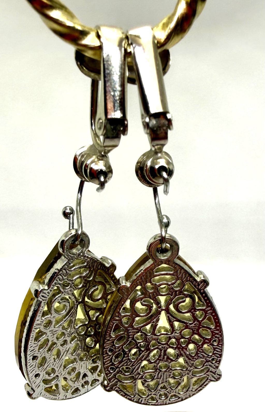 This is a gorgeous filigree teardrop necklace and earring set in mixed gold and silver tones.