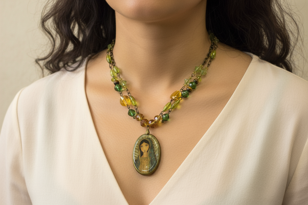 This lovely necklace measures 24 inches long, featuring a 2-inch pendant crafted from sturdy lucite with a charming Mary illustration.