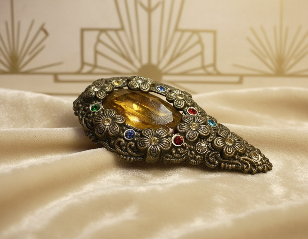 Perfect for cinching a shawl, securing a neckline, or adding glamorous flair to modern pieces, it's a wearable work of art that whispers stories of golden-age elegance. A stunning statement for vintage enthusiasts and fashion lovers alike.