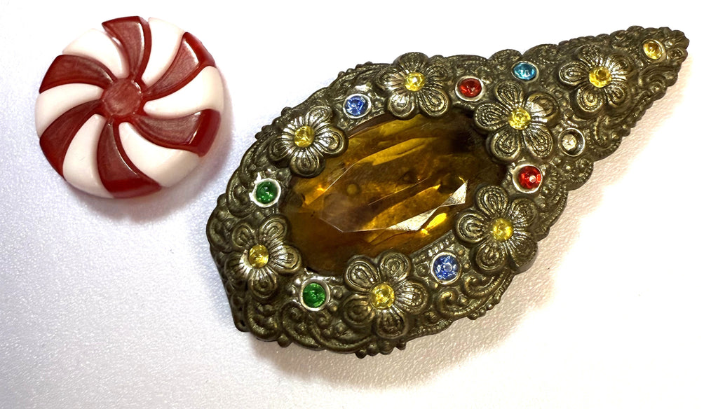 Gorgeous silver tone filigree - Adorned by stones yellow red and blue with an emerald cut centerpiece in amber coloured glass