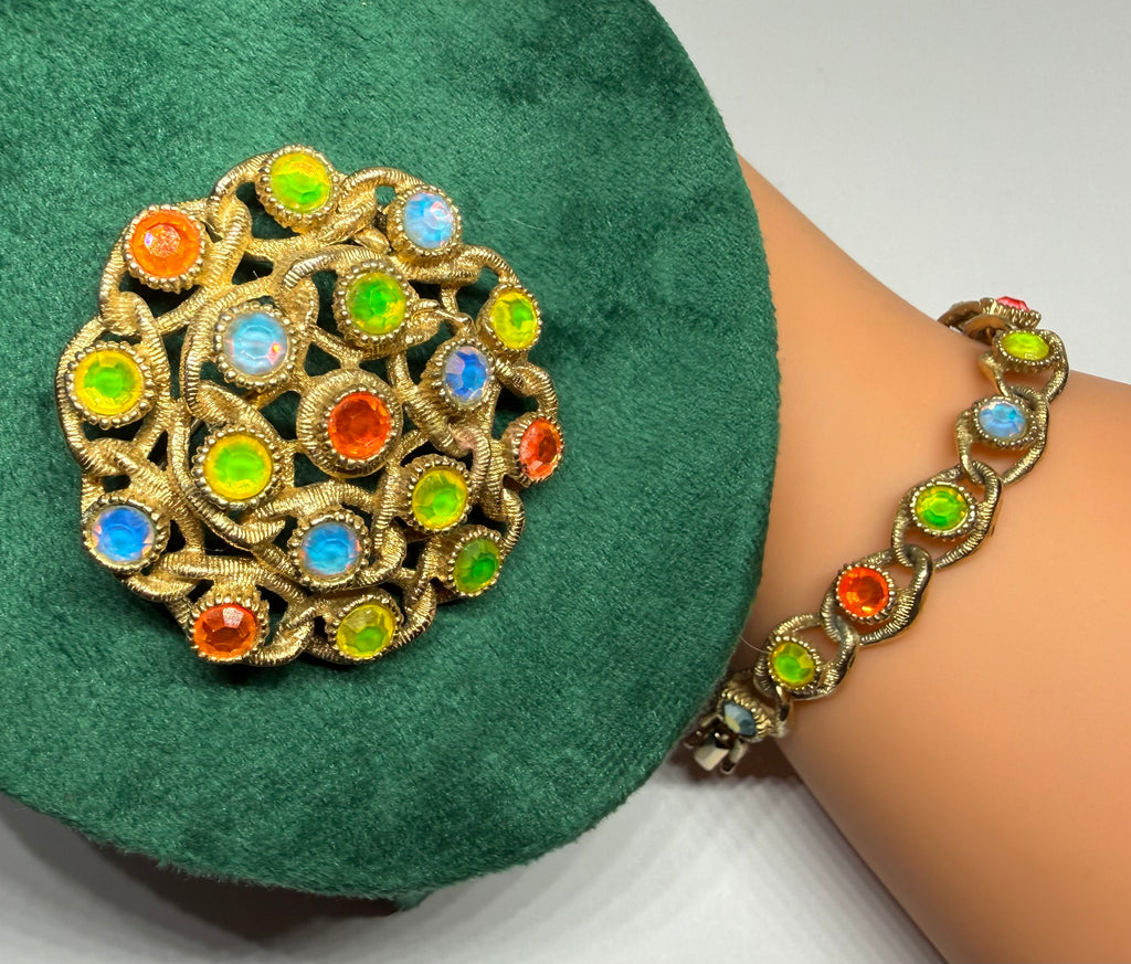 This jewelry set is part of the "Moon-Lites" collection by vintage American brand Sarah Coventry, introduced in 1970. It includes a brooch and bracelet with textured gold-tone metal and multi-colored, iridescent rhinestones.