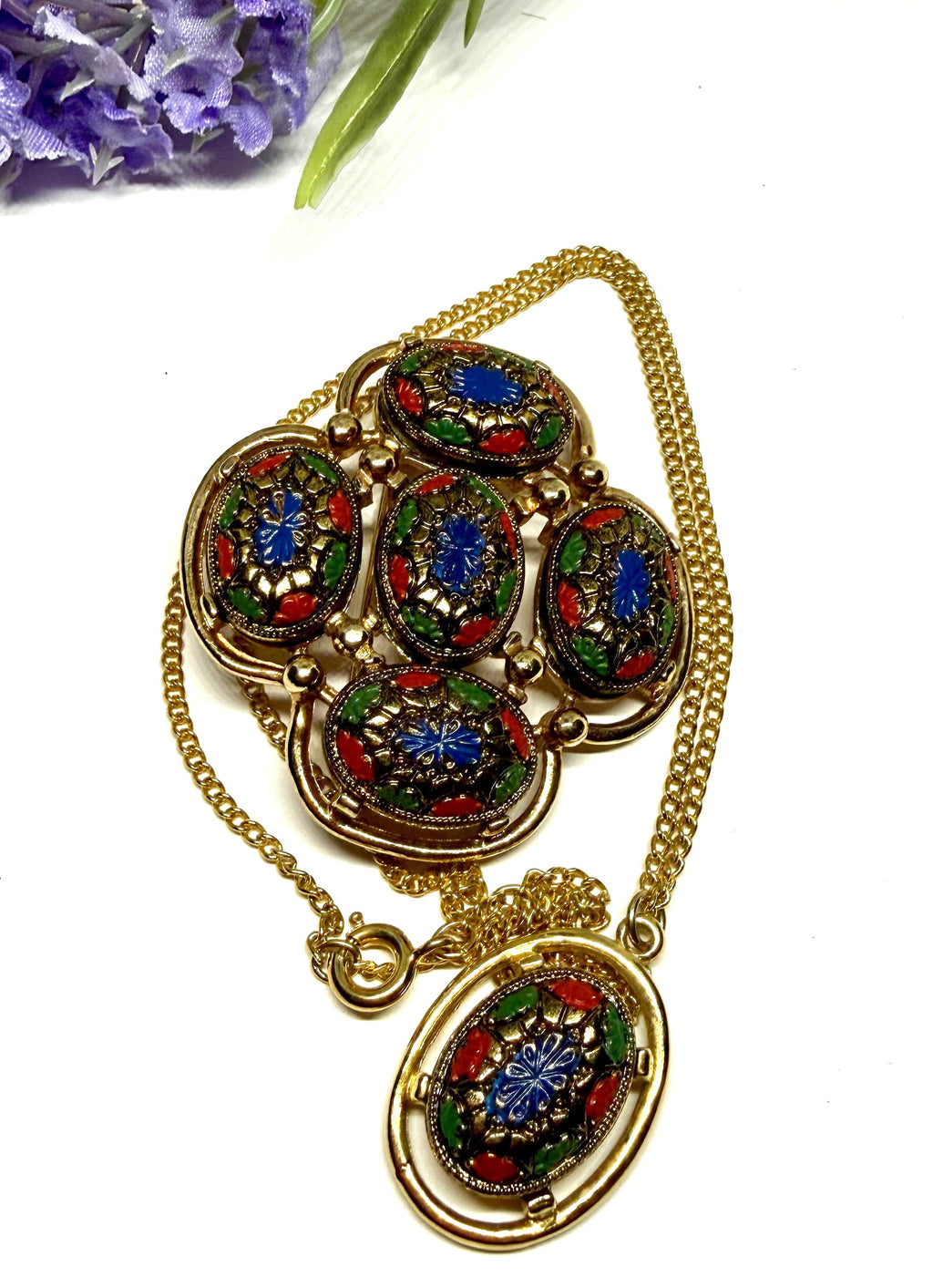 · Materials: Gold-tone metal with enamel mosaic-style cabochons in blue, red, and green; enamel is painted or faux mosaic glass.