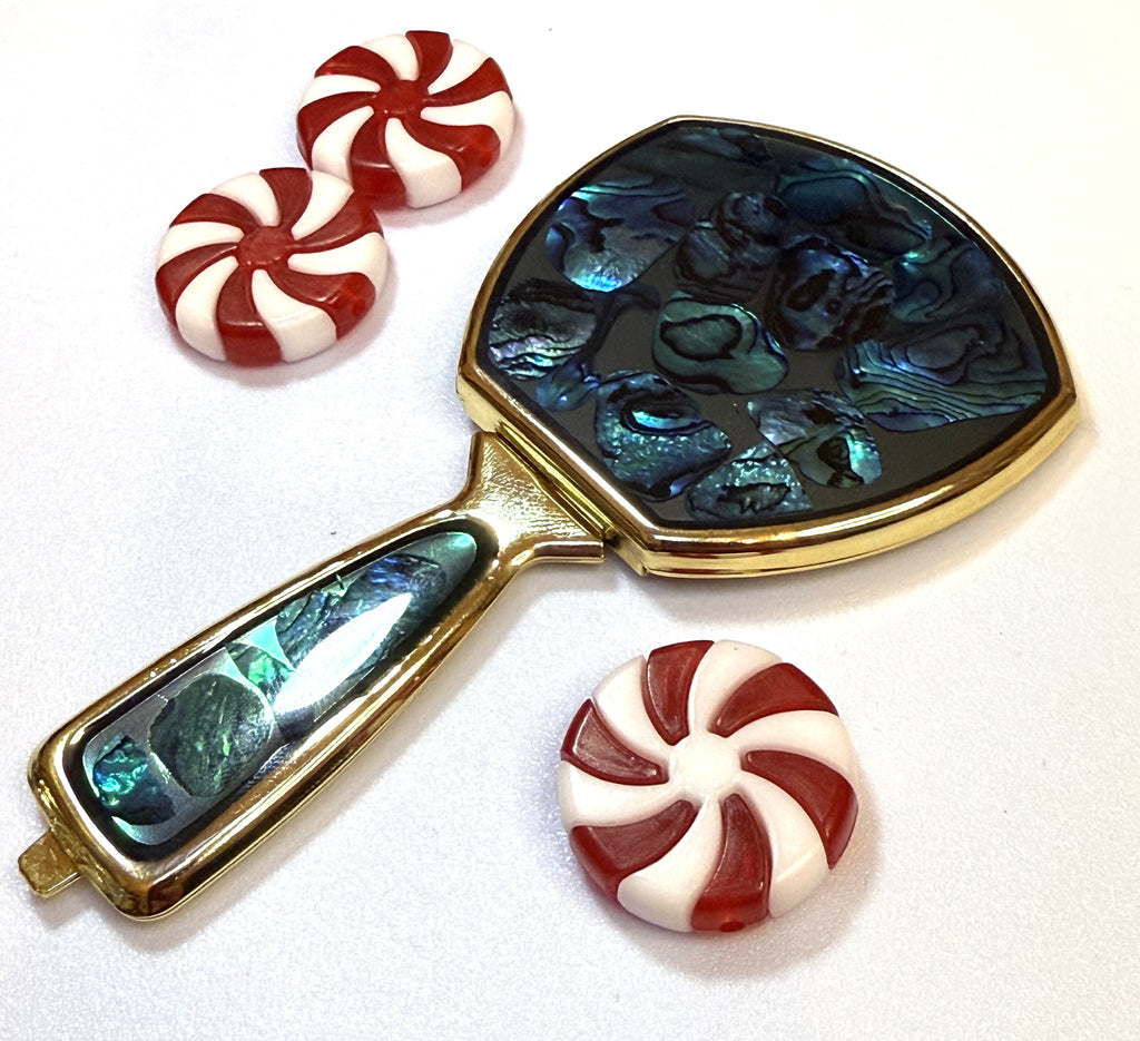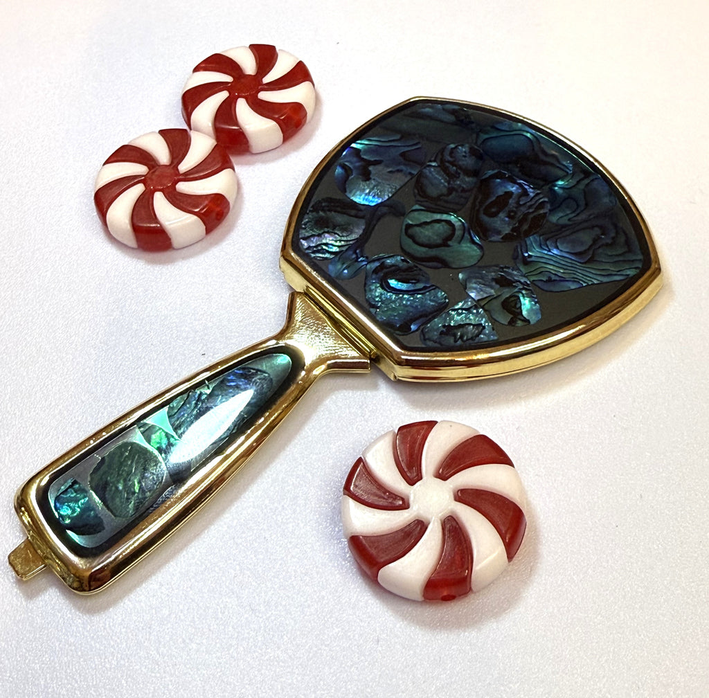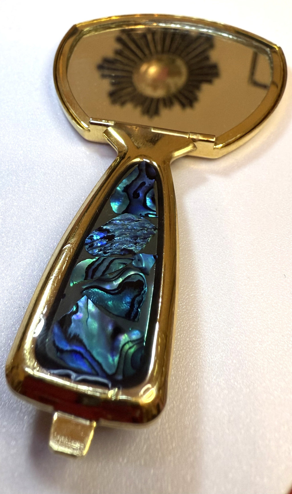 Catch your reflection in style with this charming vintage abalone foldable hand mirror.