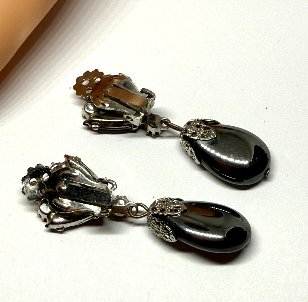 These are stunning drop hematite earrings with rhinestones. They are gorgeous 1960s, near mint condition and gorgeous!