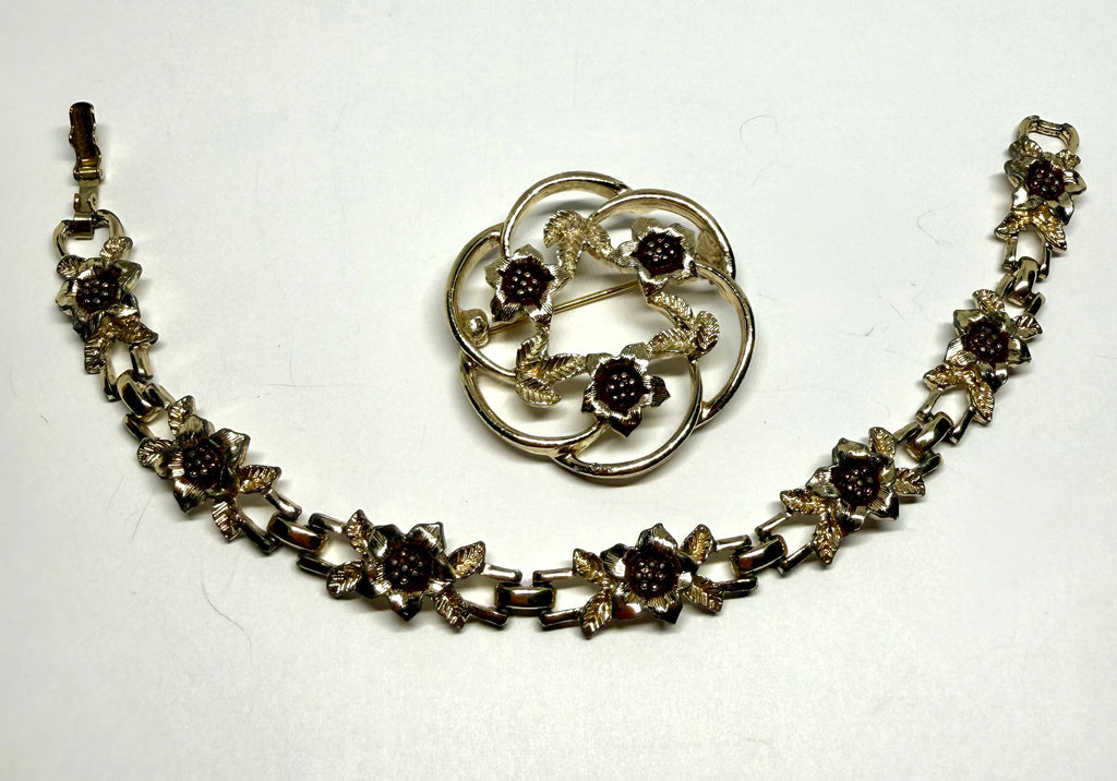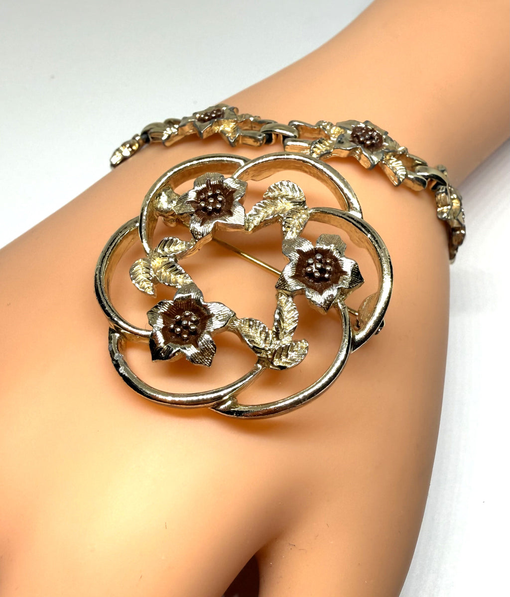 This vintage 1975 Sarah Coventry Strawflower gold-toned brooch and matching bracelet with brown enamel accents. The brooch features a circular wreath design with four flowers and leaves, and the bracelet has a continuous floral link pattern.